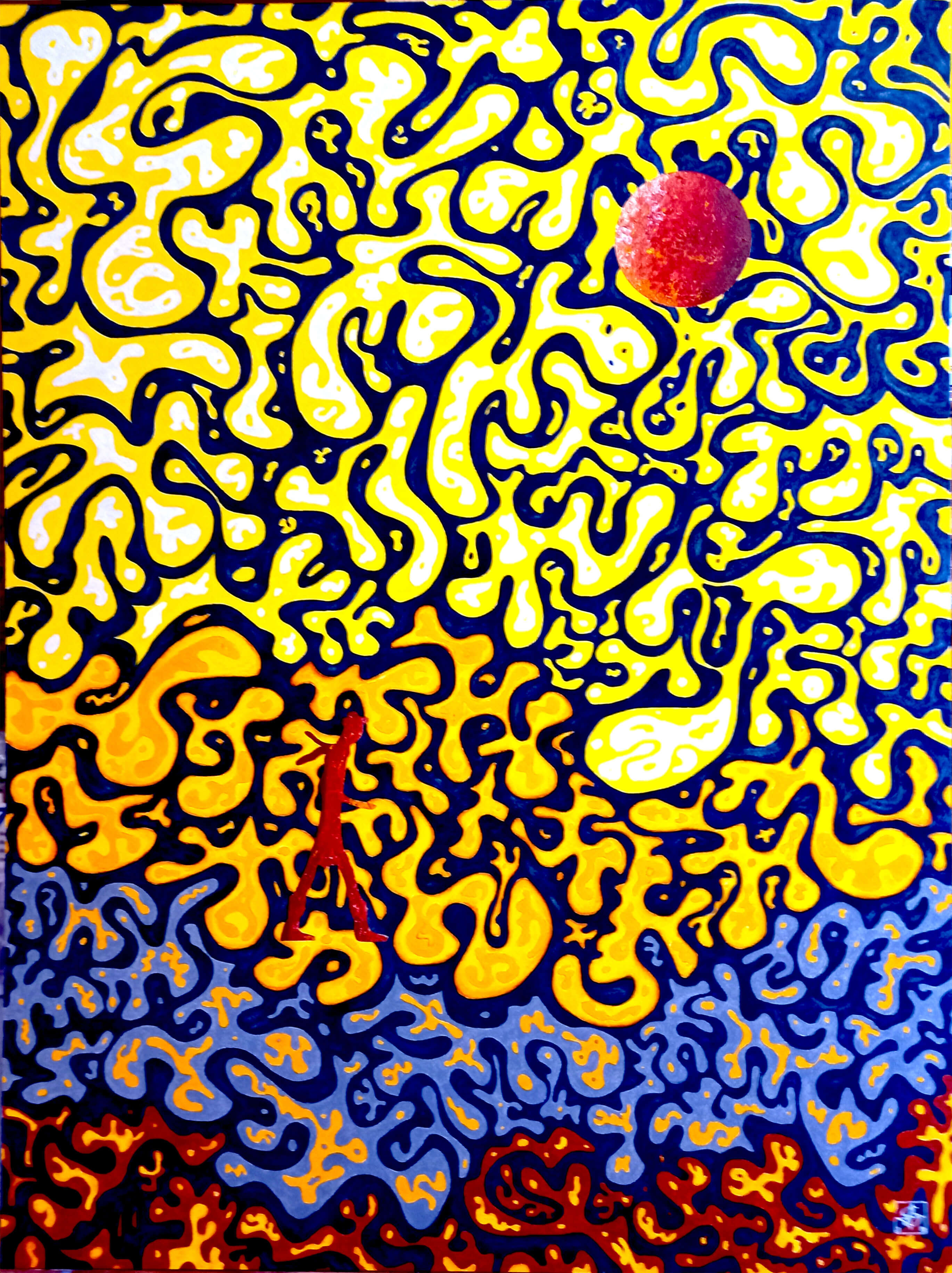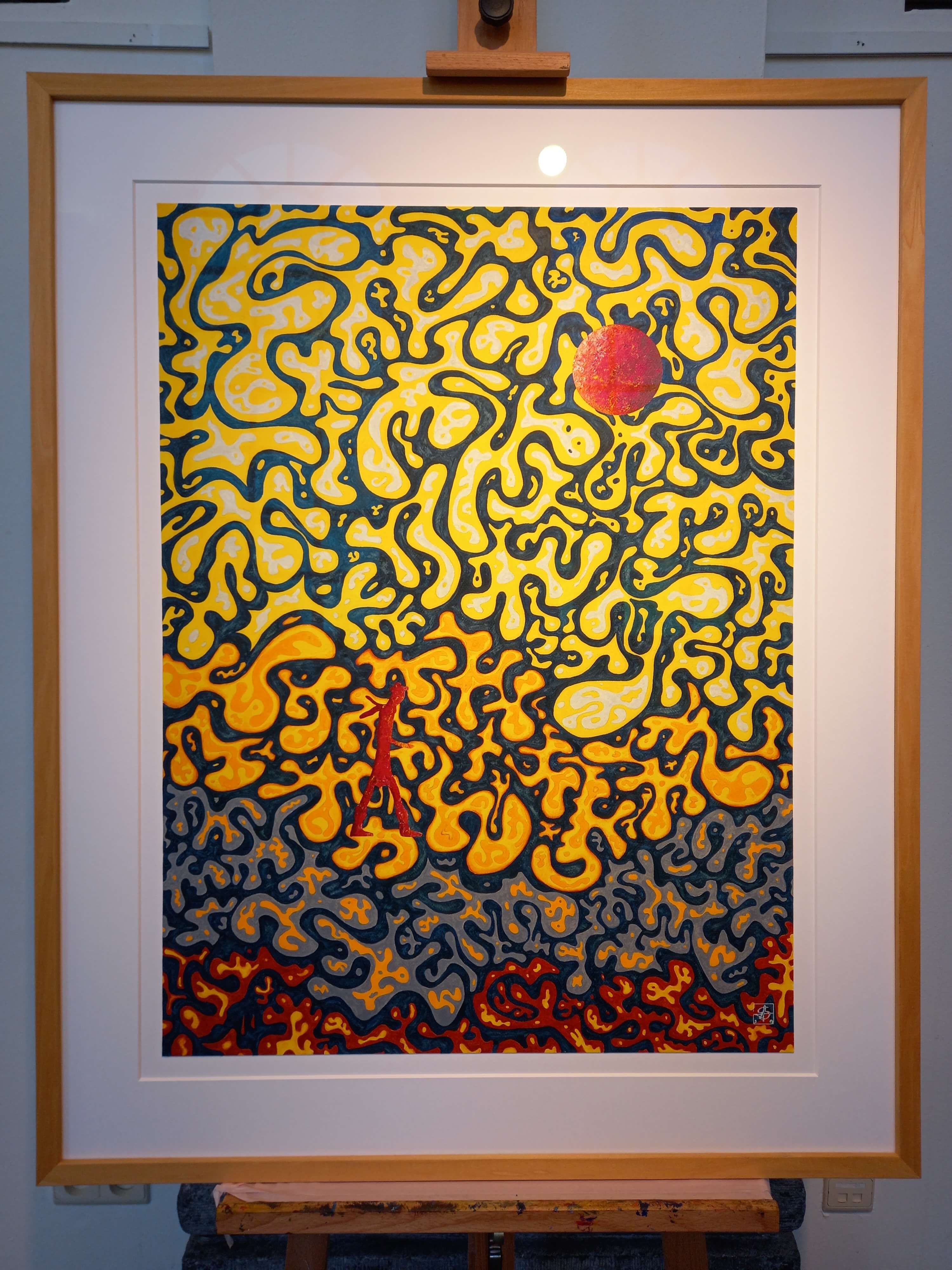 Kleurrijk werk - olieverf op papier - formaat 60x80 cm - ingekaderd.