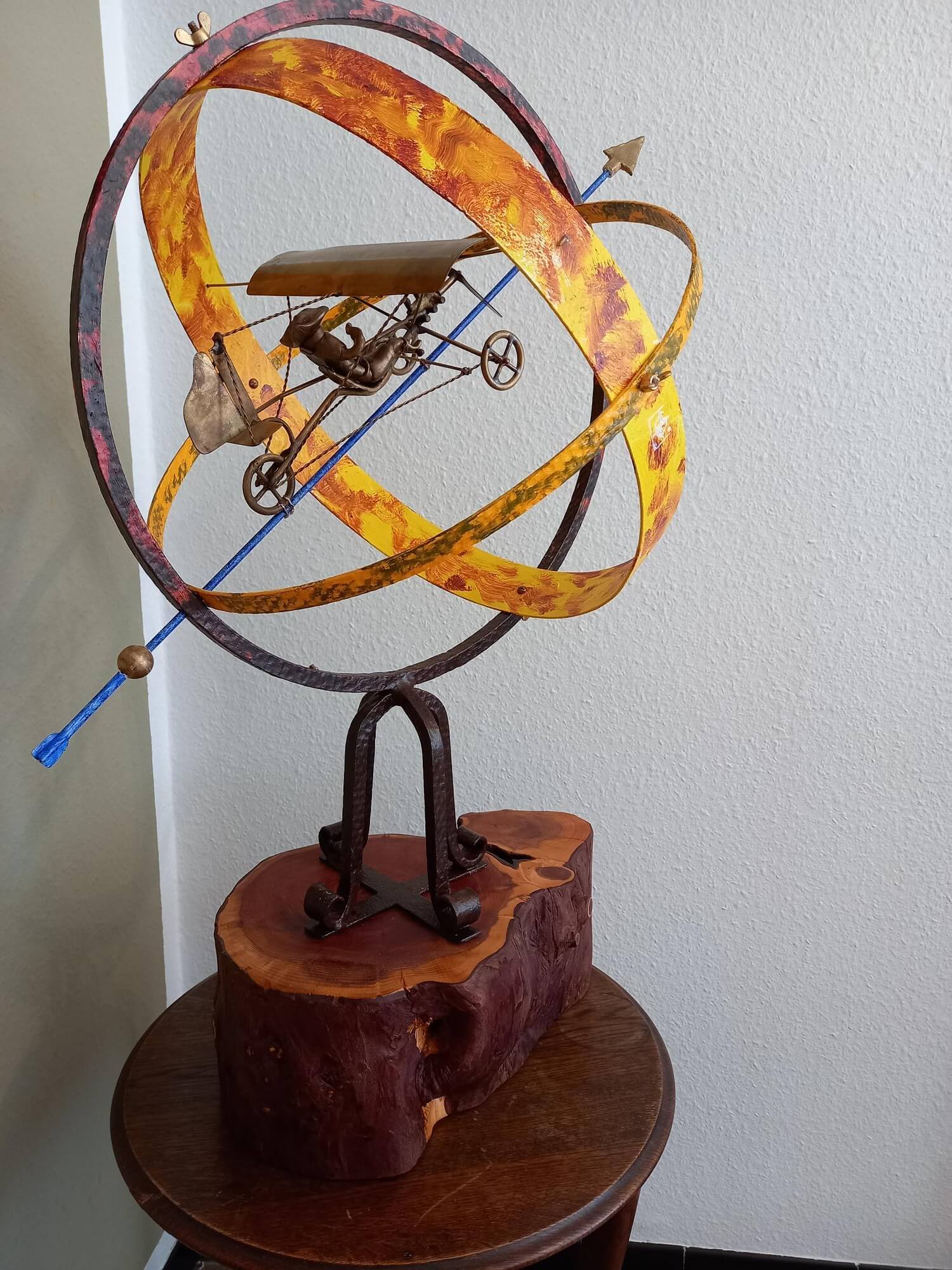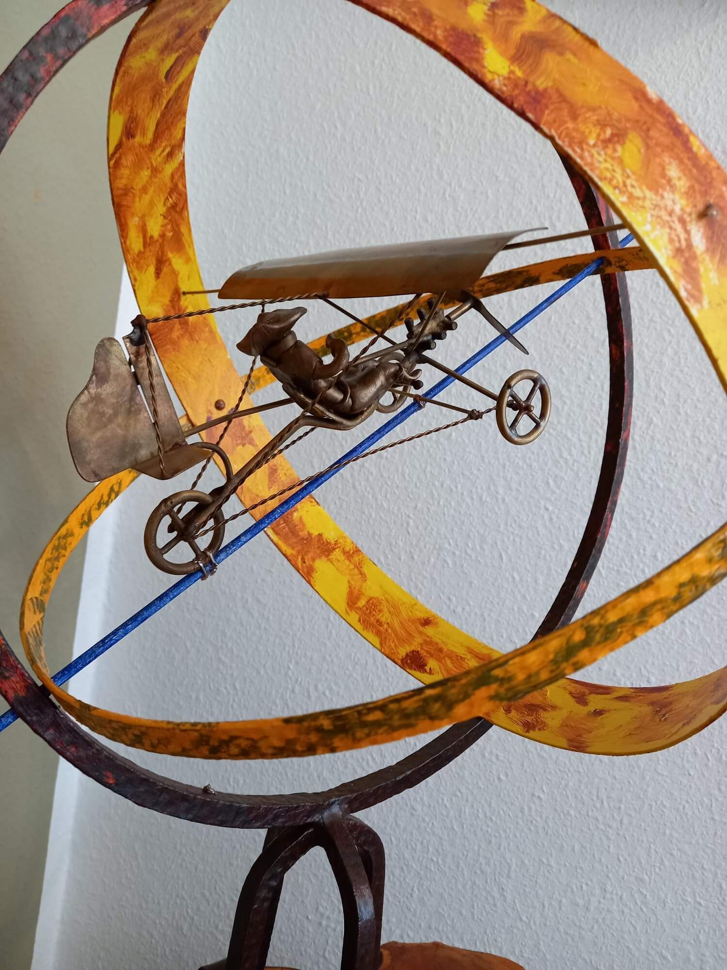 De Reiziger gemonteerd in een vliegtuigje en gemonteerd in een oude zonnewijzer. Olieverf.