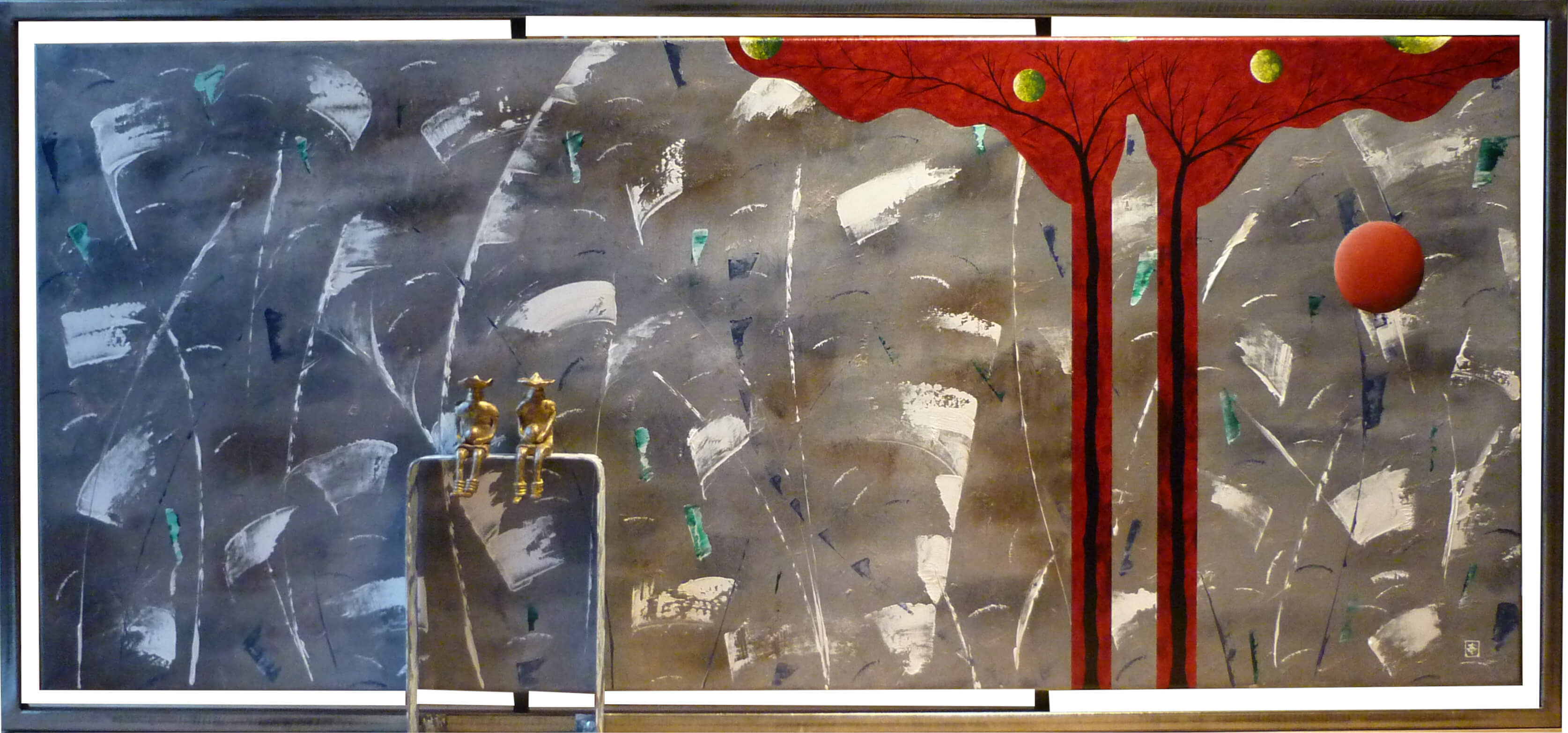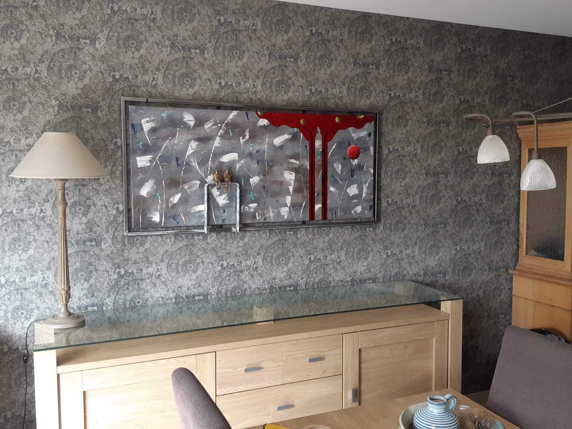 Werk in opdracht voor een tevreden klant. Met knipoog naar de familiale situatie: een tweeling in huis, gebeten door competitievolleybal. Kleurcompositie speelt in op de plaats waar het werk wordt opgehangen.